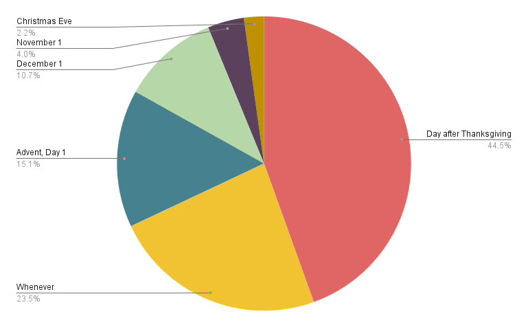 Iām a combination of āday after Thanksgivingā and āfirst day of Adventāābut gradually, if I can help it (though some seasons honestly call for more decor earlier on). The key in all thisāand maybe Iāll ask you this in a future pollāis when you take your decor down. Because thereās an objectively correct answer to that one.
